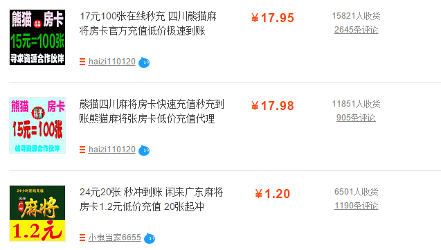 上图是某些游戏在淘宝上的房卡月销售量,仅淘宝一个渠道的月收入,就差不多30万。要知道此类房卡游戏大部分的充值,都是在关注微信公众号后进行的,淘宝充值的占比估计都达不到总充值金额的1%。而找网狐(微信ID:wanghukeji)定制开发一款此类房卡游戏,成本也就在20万左右。