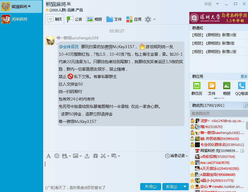 在网狐(微信公众号: wanghukeji)之前的文章中我们说过,其实很大程度上你的竞争对手已经帮你筛选好你的用户群了。你只需要搜索闲来麻将、熊猫麻将等QQ群,就能找到一大批你的潜在客户。看到这里,可能大部分运营商会采取群内临时会话的方式去推广自己的产品。这种办法虽然笨,但是确实是有效的。